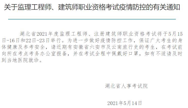 湖北省關(guān)于2021年監(jiān)理工程師資格考試疫情防控有關(guān)通知