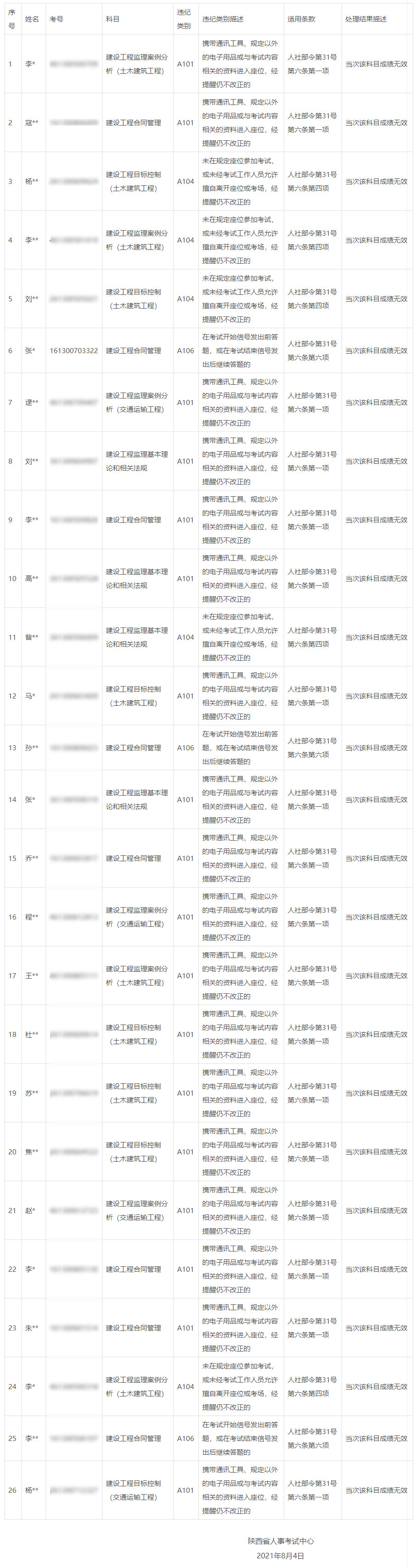 根據(jù)人力資源和社會保障部《專業(yè)技術(shù)人員資格考試違紀(jì)違規(guī)行為處理規(guī)定》(人社部令第31號),陜西省人事考試中心經(jīng)核實(shí)有關(guān)應(yīng)試人員違紀(jì)違規(guī)行為事實(shí)后研究決定,擬對參加2021年度監(jiān)理工程師職業(yè)資格考試陜西考區(qū)有違紀(jì)違規(guī)行為的應(yīng)試人員作相應(yīng)處理。此公告涉及的違紀(jì)違規(guī)應(yīng)試人員,自公告發(fā)布之日起5個(gè)工作日內(nèi),可根據(jù)有關(guān)規(guī)定向省人事考試中心書面提交復(fù)核申請,逾期不再受理?,F(xiàn)將有關(guān)情況公告如下: