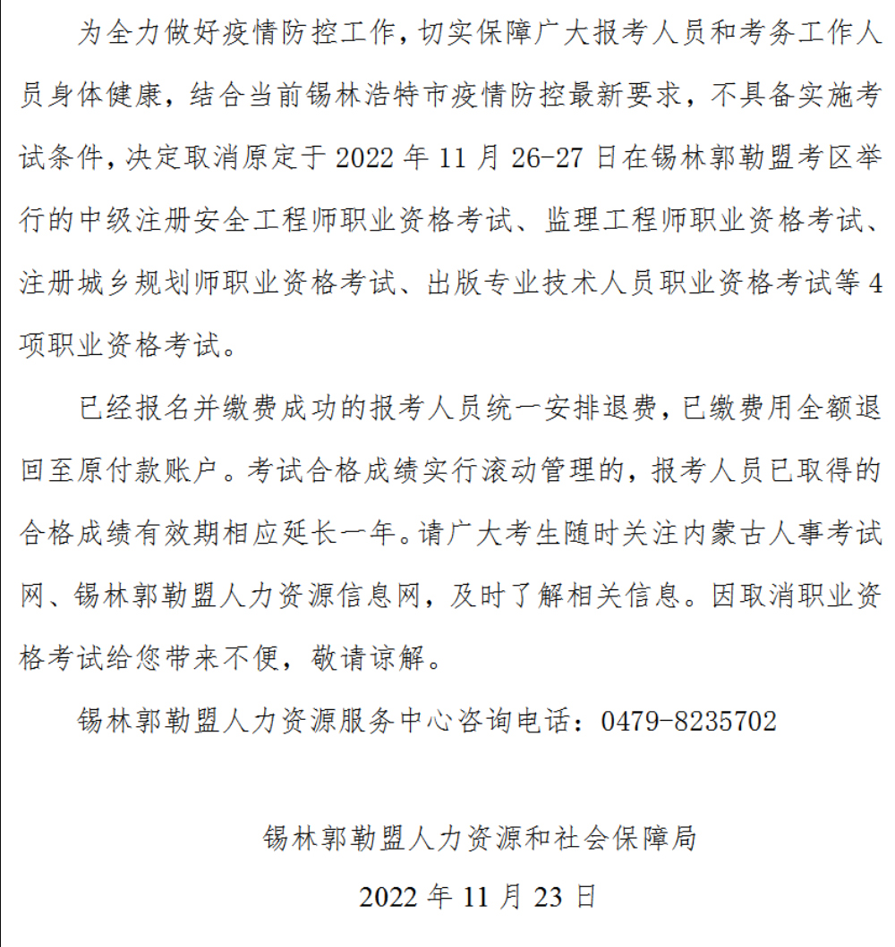 關(guān)于取消舉行2022年度全國(guó)注冊(cè)城鄉(xiāng)規(guī)劃師考試等4項(xiàng)資格考試錫林郭勒盟考區(qū)筆試工作的通告