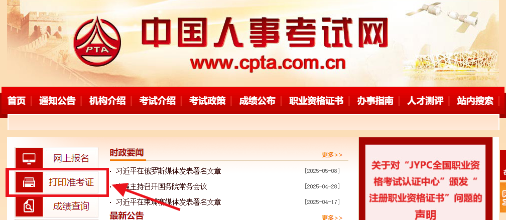 1.打開(kāi)中國(guó)人事考試網(wǎng)(http://www.cpta.com.cn/),點(diǎn)擊左側(cè)“準(zhǔn)考證打印按鈕”