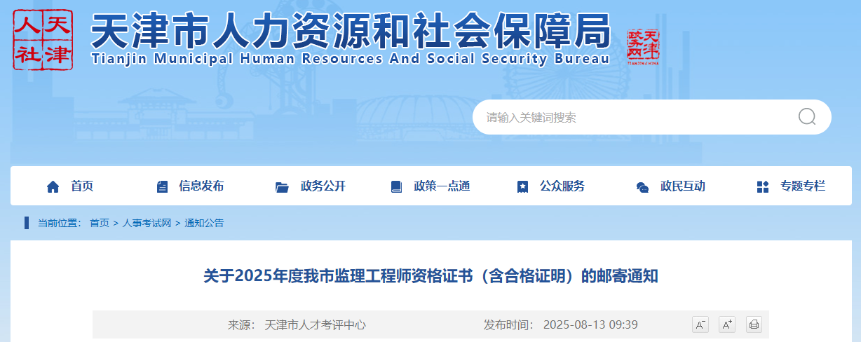 2025年度天津監(jiān)理工程師資格證書(含合格證明)的郵寄最新通知,目前證書郵寄網(wǎng)上預(yù)定工作已結(jié)束,預(yù)計(jì)本周寄出,官方通知如下: