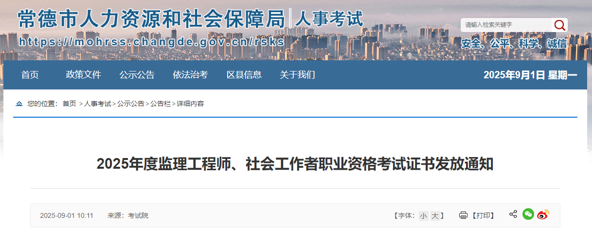 常德考區(qū)2025年度監(jiān)理工程師、社會工作者職業(yè)資格考試證書現(xiàn)已開始發(fā)放。