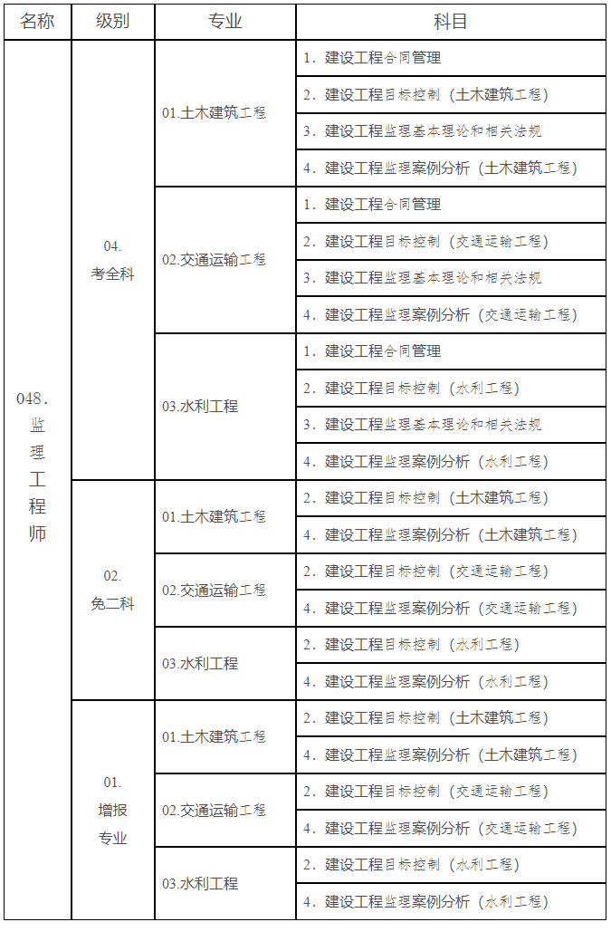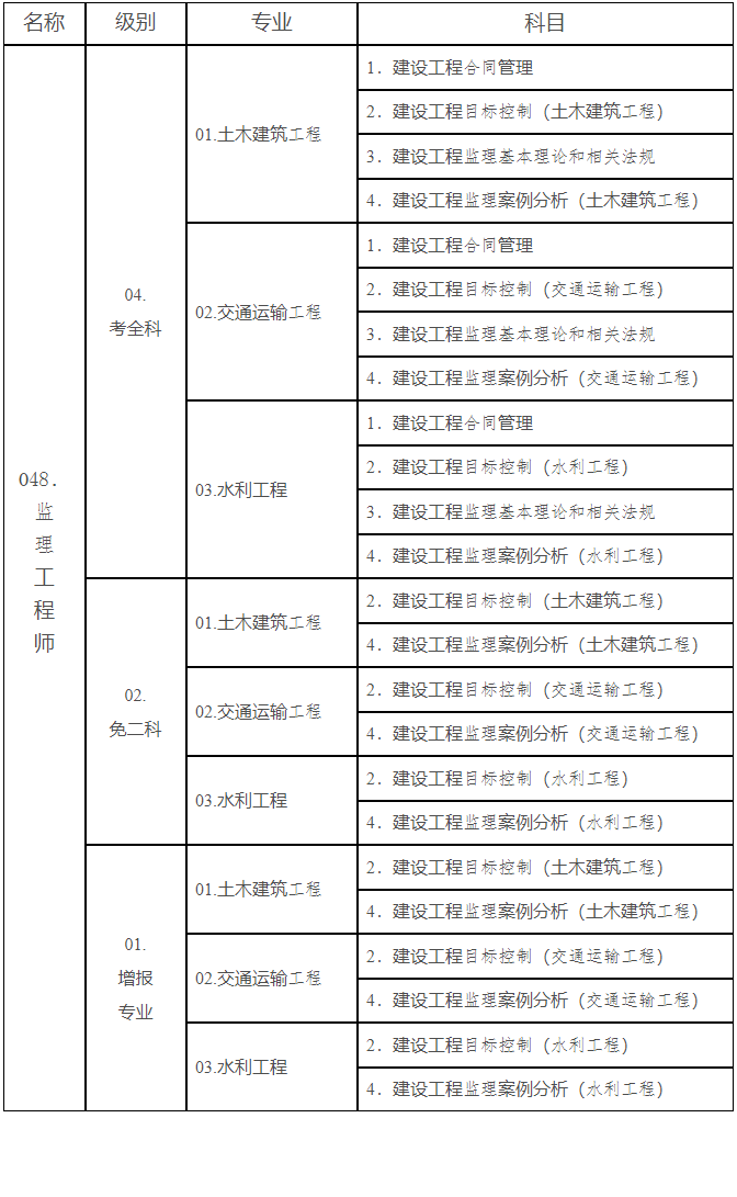 2.監(jiān)理工程師職業(yè)資格考試專業(yè)和科目名稱
