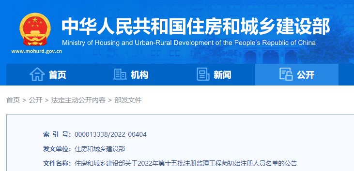 住建部關(guān)于2022年第十五批注冊(cè)監(jiān)理工程師初始注冊(cè)人員名單的公告