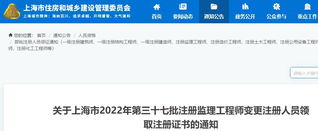 關(guān)于上海市2022年第三十七批注冊(cè)監(jiān)理工程師變更注冊(cè)人員領(lǐng)取注冊(cè)證書(shū)的通知