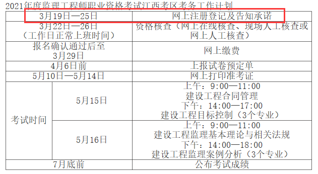 江西發(fā)布關于做好2021年度監(jiān)理工程師職業(yè)資格考試考務工作的通知,其中公布了監(jiān)理工程師報名時間:3月19日-25日,具體內(nèi)容如下: