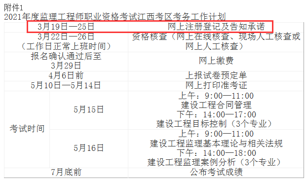江西發(fā)布關于做好2021年度監(jiān)理工程師職業(yè)資格考試江西考區(qū)考務工作的通知,其中公布了江西監(jiān)理工程師報名時間為3月19-25日,具體內(nèi)容如下: