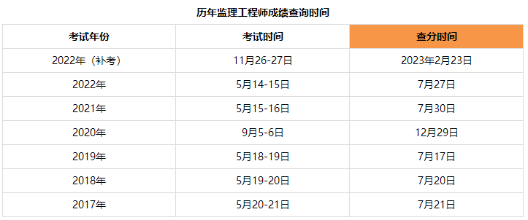 考試成績一般在考試結(jié)束2~3個月后公布,預計2023監(jiān)理工程師考試成績查分時間為7月下旬,下表為歷年監(jiān)理工程師考試成績查詢時間,供參加監(jiān)理考試的各位考生參考。