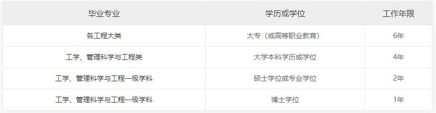 (二)具有工學(xué)、管理科學(xué)與工程類專業(yè)大學(xué)本科學(xué)歷或?qū)W位,從事工程施工、監(jiān)理、設(shè)計等業(yè)務(wù)工作滿4年;