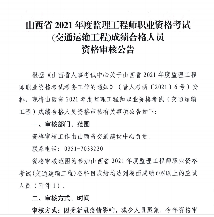 山西省2021年度監(jiān)理工程師職業(yè)資格考試(交通運(yùn)輸工程)成績(jī)合格人員資格審核公告