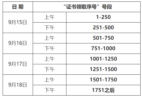 現(xiàn)場(chǎng)辦理的考生請(qǐng)先關(guān)注微信公眾號(hào)“阜陽(yáng)人社”,點(diǎn)擊功能區(qū)“人社服務(wù)---證書(shū)查詢”,輸入證件號(hào)碼獲取“證書(shū)領(lǐng)取序號(hào)”,按照下表的工作安排前往辦理。