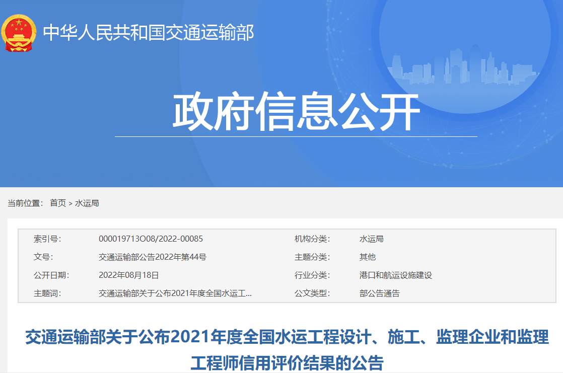 交通運輸部關(guān)于公布2021年度全國水運工程設(shè)計、施工、監(jiān)理企業(yè)和監(jiān)理工程師信用評價結(jié)果的公告