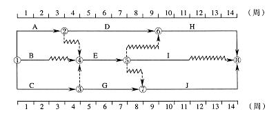 某工程雙代號時標網(wǎng)絡(luò)計劃如下圖所示,如果B.D.I三項工作共用一臺施工機械且必須順序施工,則總工期( )。(2006年)