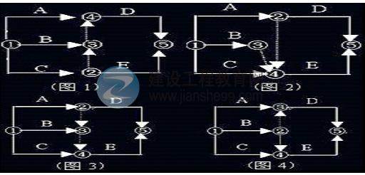 某雙代號(hào)網(wǎng)絡(luò)圖有A.B.C.D.E五項(xiàng)工作,其中A.B完成后D開始,B.C完成后E開始。能夠正確表達(dá)上述邏輯關(guān)系的圖形是( )。