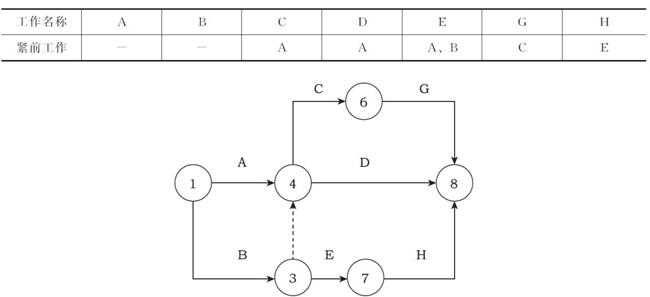 根據(jù)下表給定的邏輯關(guān)系繪制的分部工程雙代號(hào)網(wǎng)絡(luò)計(jì)劃如下圖所示,其作圖錯(cuò)誤的是( )。