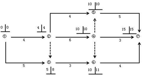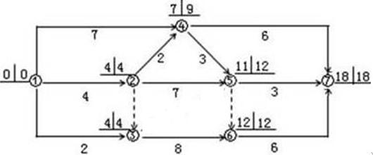 【解析】本題考查的是關(guān)鍵路線法(CPM)。選項B錯誤,關(guān)鍵線路為①→②→④→⑤→⑦,工作4-7不是關(guān)鍵工作;選項C錯誤,工作的總時差等于該工作完成節(jié)點的最遲時間減去該工作開始節(jié)點的最早時間所得差值再減其持續(xù)時間,工作2-5的總時差為10-4-4=2(天);選項D錯誤,工作3-6的總時差為11-5-3=3(天)。參見教材P38。