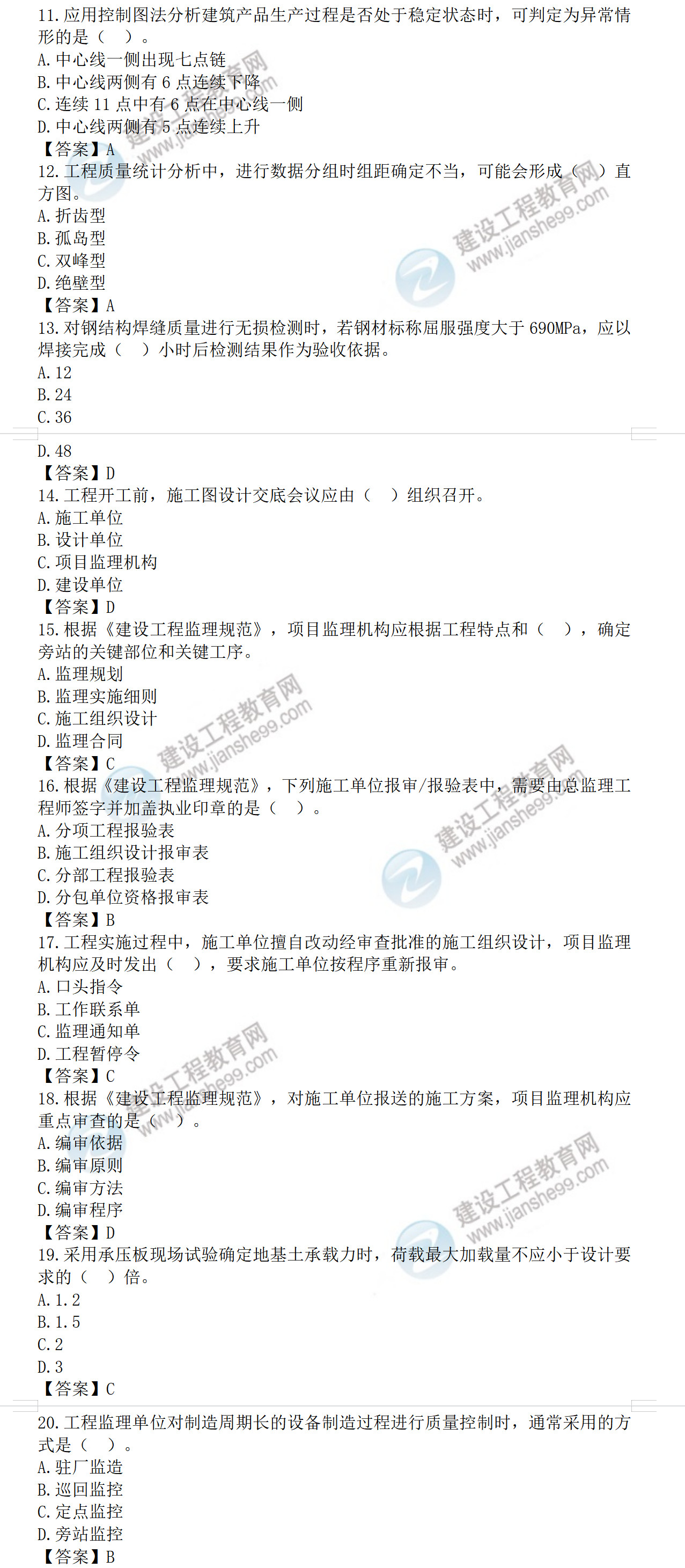 2022年監(jiān)理工程師目標(biāo)控制土建考試答案11-20題(補(bǔ)考)