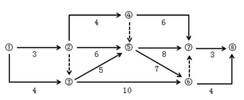 【答案解析】 本題考查的是標(biāo)號(hào)法。關(guān)鍵線路有4條,分別為①→②→⑤→⑦→⑧、①→②→⑤→⑥→⑧、①→③→⑤→⑦→⑧和①→③→⑤→⑥→⑧。參見(jiàn)教材P54。