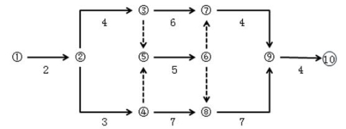 【答案解析】 本題考查的是標(biāo)號(hào)法。關(guān)鍵路線是①→②→④→⑧→⑨→⑩。工期=2+3+7+7+4=23天。參見教材P54。