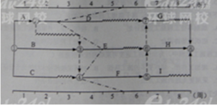 某工程雙代號時(shí)標(biāo)網(wǎng)絡(luò)計(jì)劃執(zhí)行到第5周末時(shí),實(shí)際進(jìn)度前鋒線如下圖所示,從圖中可以看出(?。?。