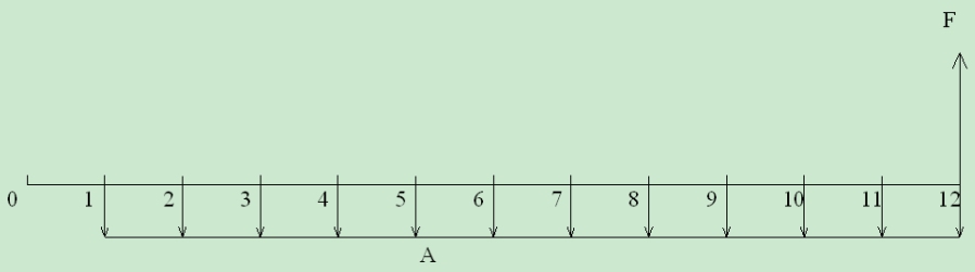 從一月份開(kāi)始,每月月末存入銀行200元,包括1月份,也包括12月份,一共12個(gè)月?,F(xiàn)金流量圖如下。