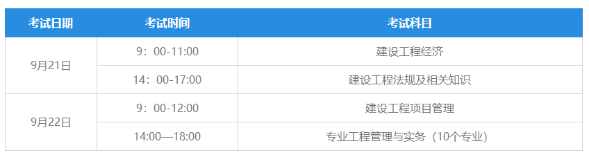 2019年一級(jí)建造師考試時(shí)間為9月21日至22日,具體安排如下: