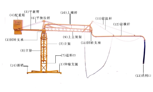 混凝土布料機是泵送混凝土的末端設(shè)備,其作用是將泵壓來的混凝土通過管道送到要澆筑構(gòu)件的模板內(nèi)。請看下圖: