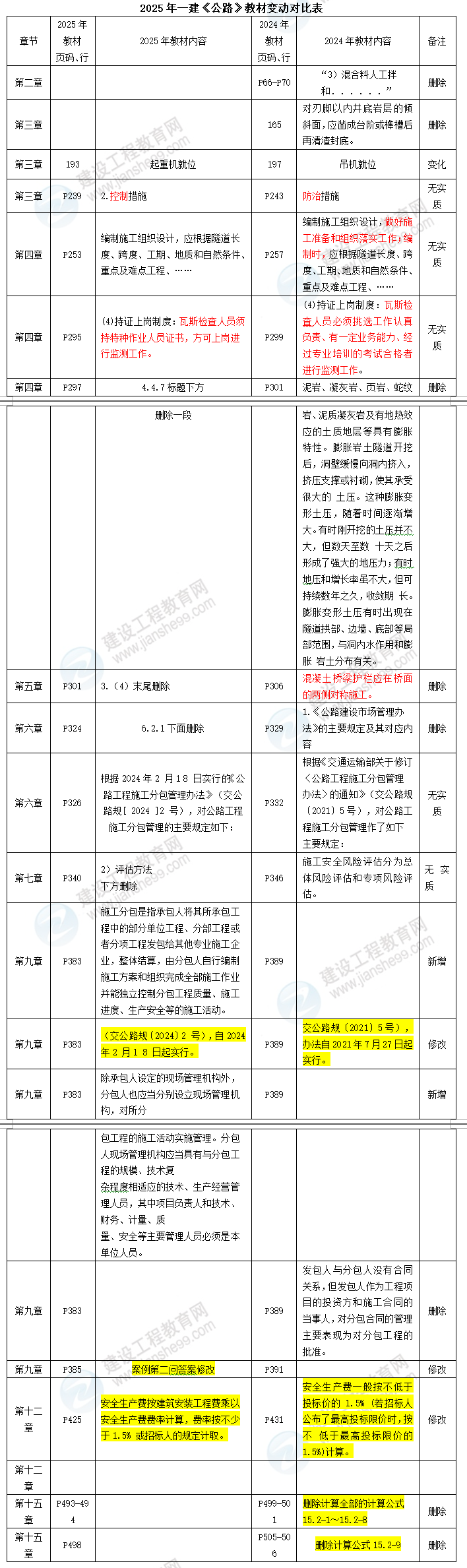 2025年一級建造師公路實(shí)務(wù)教材變動對比