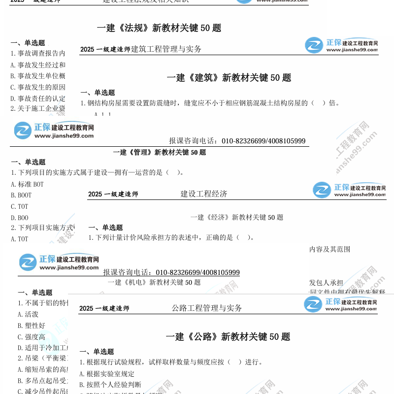 工程經(jīng)濟(jì)關(guān)鍵50題、項(xiàng)目管理關(guān)鍵50題、工程法規(guī)關(guān)鍵50題、建筑工程關(guān)鍵50題、市政工程關(guān)鍵50題、機(jī)電工程關(guān)鍵50題、公路工程關(guān)鍵50題、水利工程關(guān)鍵50題。