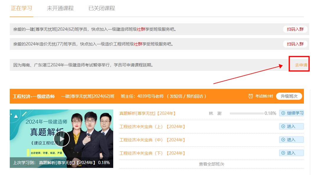 已經(jīng)報(bào)名網(wǎng)校2024年一級(jí)建造師考試超值精品班、高效實(shí)驗(yàn)班、VIP特訓(xùn)營、面授特招班、臨考特訓(xùn)班課程的??伎忌F(xiàn)在可以申請(qǐng)延期課程了,入口在“我的網(wǎng)校我的家”,請(qǐng)大家及時(shí)申請(qǐng),不要錯(cuò)過。