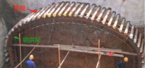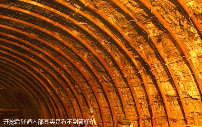 管棚是在施工隧道工程中,向前開挖之前就先圍著開挖輪廓線的外側(cè)向開挖前方以一個(gè)非常小的外插角(近乎平行于隧道)插入到土體的。