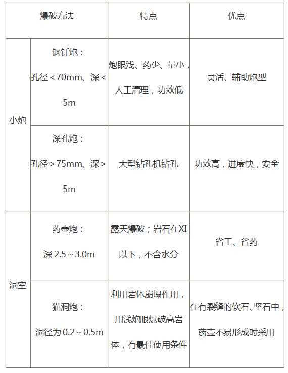 綜合爆破一般包括小炮和洞室兩大類。小炮主要包括鋼釬炮、深孔爆破等鉆孔爆破