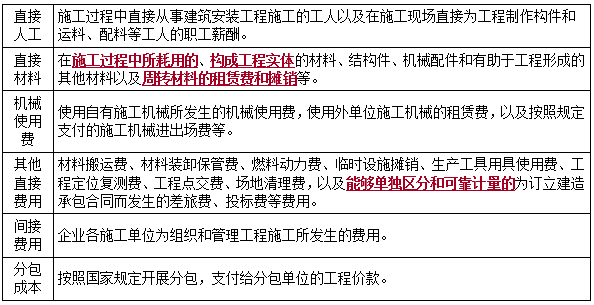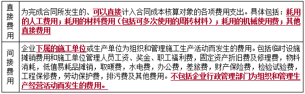 概念:工程成本包括從建造合同簽訂開(kāi)始至合同完成止所發(fā)生的、與執(zhí)行合同有關(guān)的直接費(fèi)用和間接費(fèi)用。