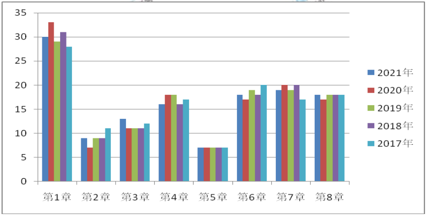 今年考試比較常規(guī),和往年相比,難度不大,大部分都是教材原文知識點,也沒有那些彎彎繞繞。就今年的考情分析,各章節(jié)分值基本沒有太大變化,考點分布較綜合,大多數(shù)考生反映《法規(guī)》試題相對簡單,下面就讓我們看一下近五年試題分值的分布情況:
