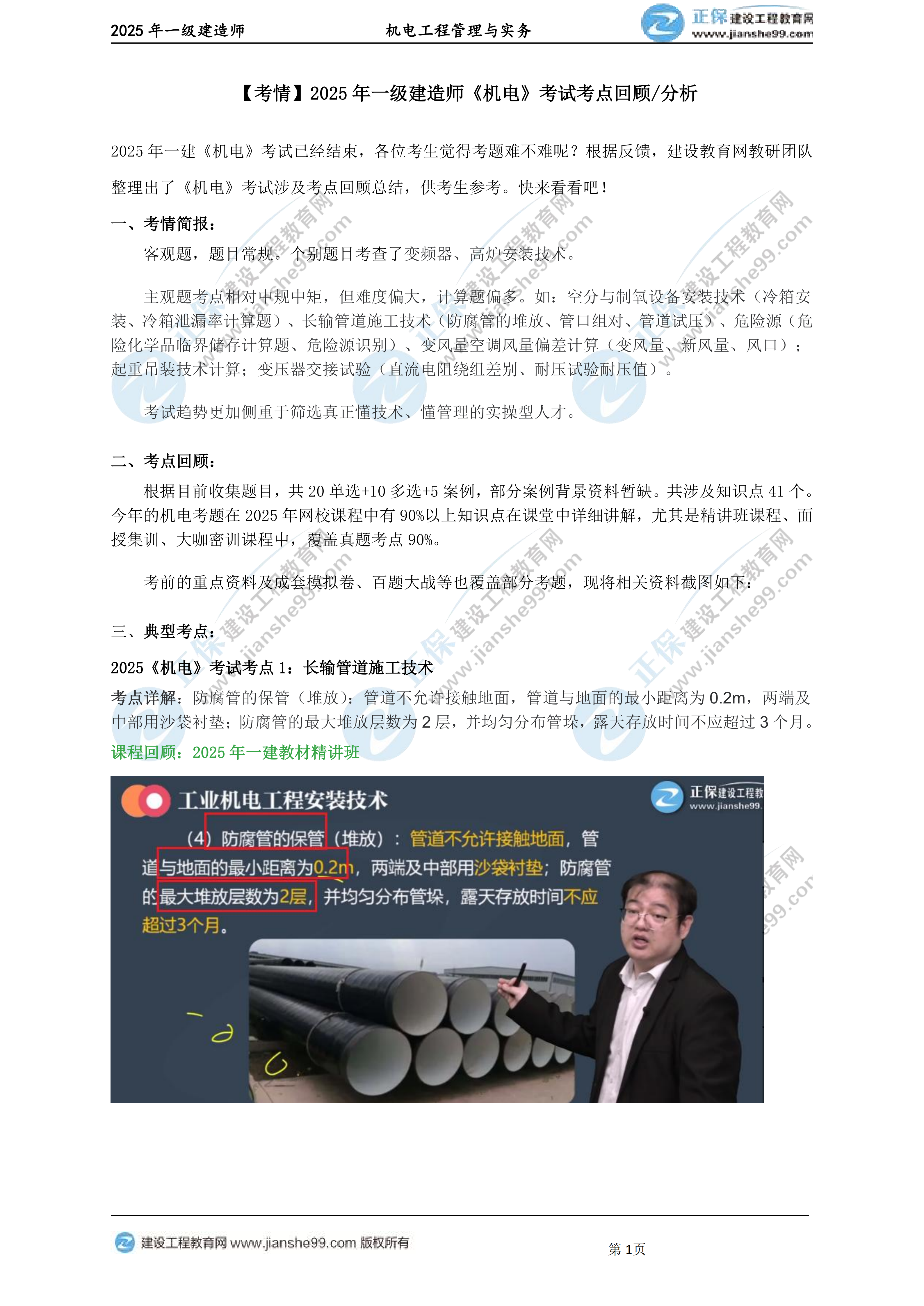 根據(jù)目前收集題目,共20單選+10多選+5案例,部分案例背景資料暫缺。共涉及知識(shí)點(diǎn)41個(gè)。今年的機(jī)電考題在2025年網(wǎng)校課程中有90%以上知識(shí)點(diǎn)在課堂中詳細(xì)講解,尤其是精講班課程、面授集訓(xùn)、大咖密訓(xùn)課程中,覆蓋真題考點(diǎn)90%。