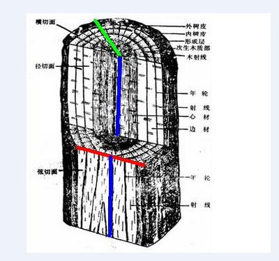 圖中紅線表示的為弦向,綠色表示的為徑向,藍(lán)色表示的為順紋方向。需要注意的是弦向不能通過(guò)髓心。