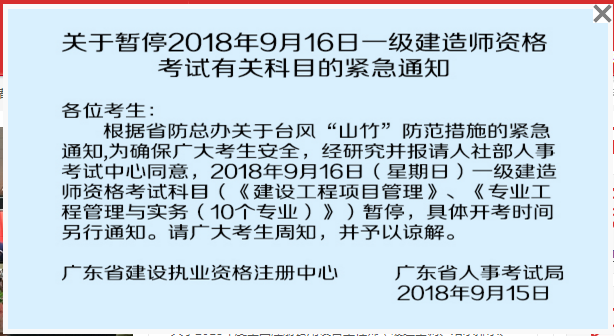 關(guān)于暫停廣東2018年9月16日一級建造師考試有關(guān)科目緊急通知