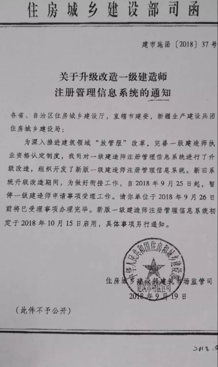 近日住建部司函關于升級改造一級建造師注冊管理信息系統(tǒng)的通知,明確新版一級建造師注冊管理信息系統(tǒng)定于2018年10月15日啟用。