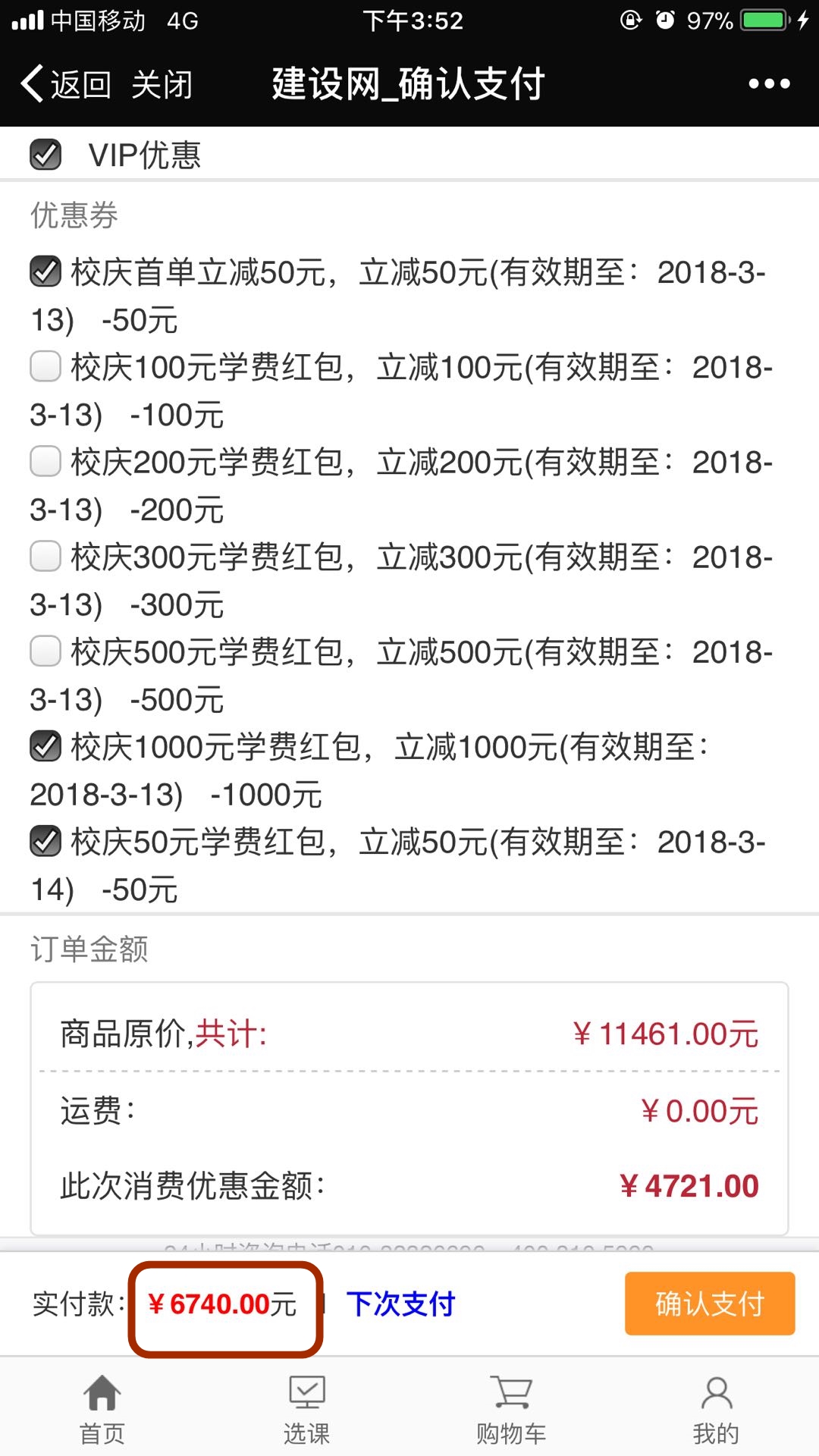 第五步:選好課程進入支付頁面,選擇可用的優(yōu)惠券紅包,享受優(yōu)惠購課,完成支付即可。