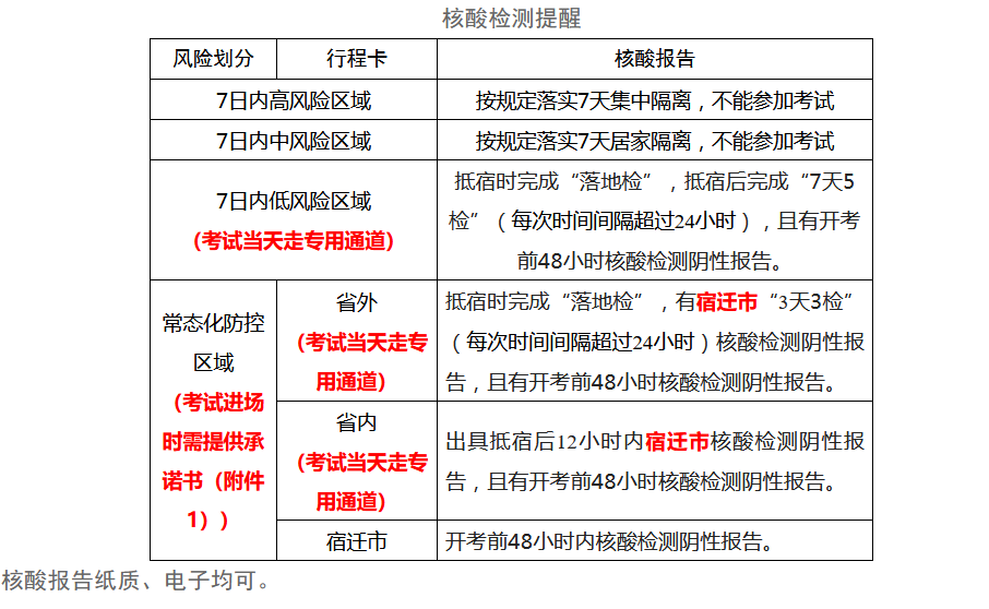2.考生除出示“蘇康碼”綠碼,現(xiàn)場測量體溫<37.3℃且無干咳等可疑癥狀外,行程卡及核酸檢測頻次要求如下: