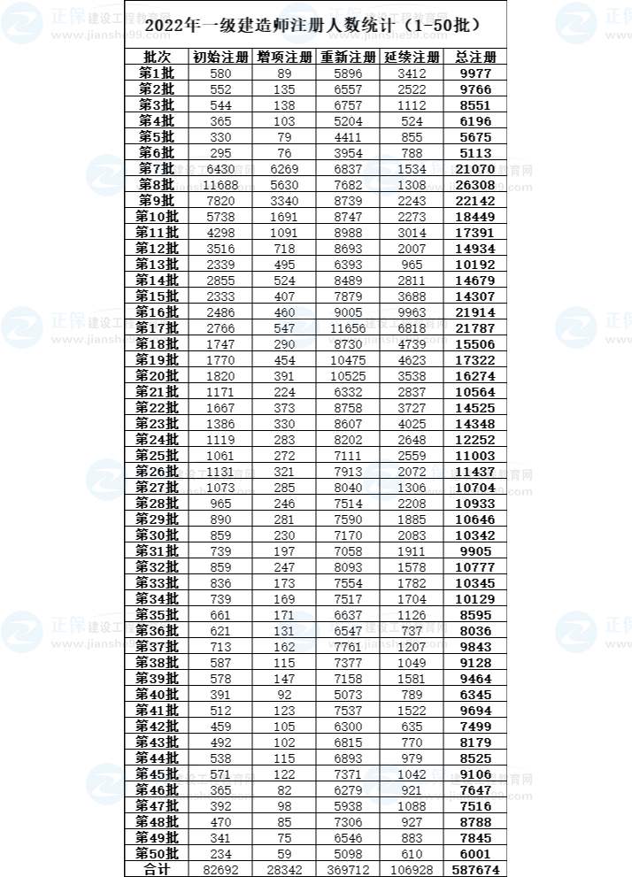 首先看一下22年的注冊情況——2022年1-50批一級建造師注冊人員名單中,累計準予587674人通過一級建造師注冊。其中初始注冊82692人,增項注冊28342人,重新注冊369712人,延續(xù)注冊106928人。