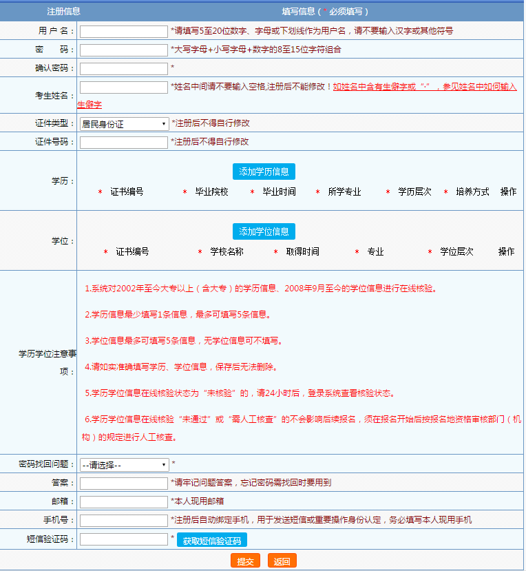 2、 身份證號、姓名將引用到報名信息中,手機和郵箱將作為報考人員接收相關(guān)考試信息的工具,請務必保證姓名、身份證號、手機和郵箱信息真實、準確、完整、有效。