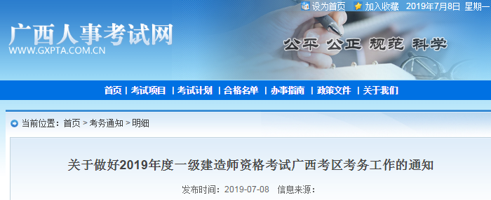 根據(jù)人力資源和社會(huì)保障部人事考試中心《關(guān)于2019年度一級(jí)建造師資格考試考務(wù)工作的通知》(人考中心函〔2019〕31號(hào))精神,結(jié)合實(shí)際,為做好2019年度一級(jí)建造師資格考試廣西考區(qū)考務(wù)工作,現(xiàn)將有關(guān)事項(xiàng)通知如下: