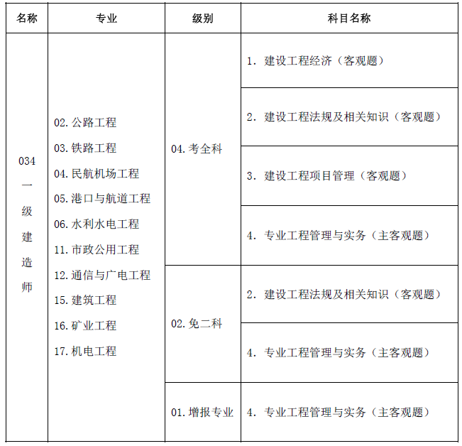 表一:一級(jí)建造師資格考試名稱(chēng)、級(jí)別、專(zhuān)業(yè)及考試科目信息