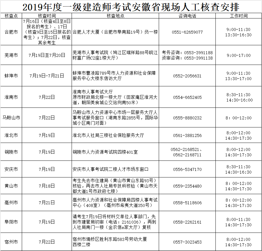 2019年度一級(jí)建造師考試安徽省現(xiàn)場(chǎng)人工核查安排公示