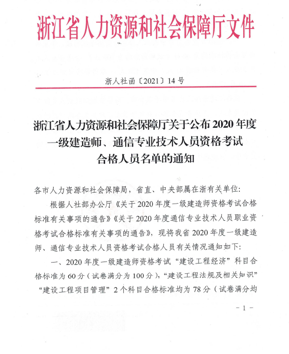 浙江省人力資源和社會保障廳關(guān)于公布2020年度一級建造師、通信專業(yè)技術(shù)人員