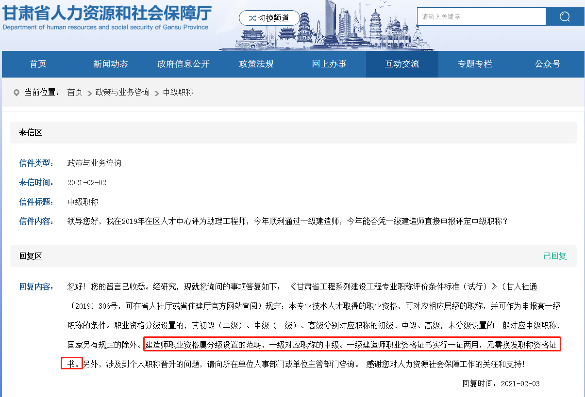 甘肅人社廳:一級(jí)建造師證書對(duì)應(yīng)中級(jí)職稱,實(shí)行一證兩用