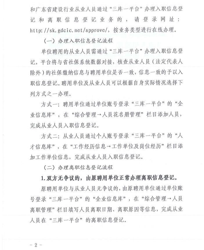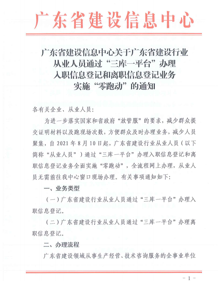 廣東省建設信息中心關于廣東省建設行業(yè)從業(yè)人員通過“三庫一平臺”辦理入職信息登記和離職信息登記業(yè)務實施“零跑動”的通知