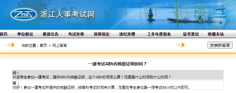 浙江人事考試網(wǎng)回復考生關(guān)于參加一級建造師考試提供的48小時內(nèi)核酸證明具體計算范圍相關(guān)問題,內(nèi)容如下: