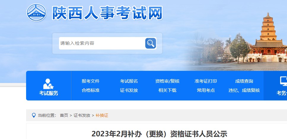 2023年2月補辦(更換)資格證書的人員已公示,會計、審計和房地產(chǎn)估價師不在公示范圍。公示期2023年2月24日至2023年3月2日。如對公示結(jié)果有異議,可向陜西省人事考試中心反映,證書領(lǐng)取另行通知,請關(guān)注本網(wǎng)站或公眾微信號sxrskswx。